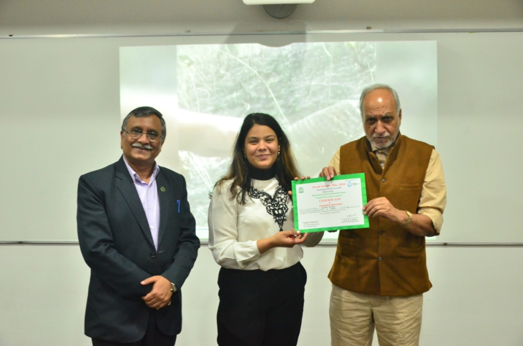 World wildlife day 2020 was enthusiastically observed by the department of Environmental Science, Integral University, Lucknow on 3rd March 2020. The theme of the event as given by United Nations was “Sustaining all life on Earth”. The animals and plants that are living in the wild have an intrinsic value and contribute to the ecological, genetic, social, economic, scientific, educational, cultural, recreational and aesthetic aspects of human well-being and sustainable development. World Wildlife Day is an opportunity to remind us of many beautiful and varied forms of wild fauna and flora and help raises awareness about its conservation.