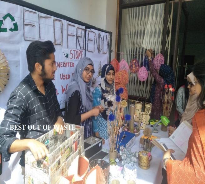 One side used paper is reused for printing etc. Students are encouraged to recycle waste by being creative and making something useful out of the waste. Exhibitions and sales of such items are done from time to time.